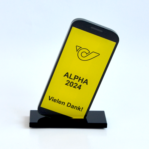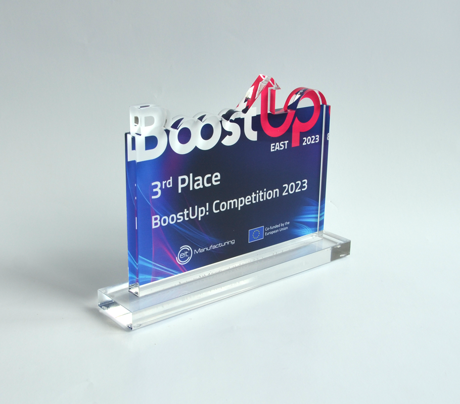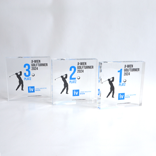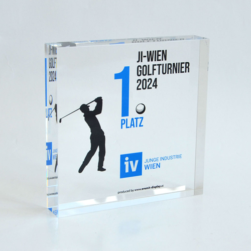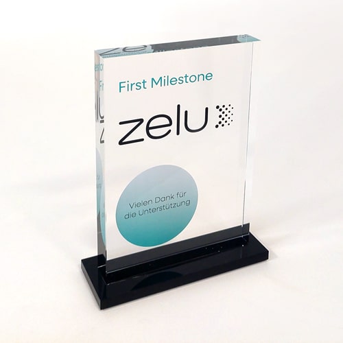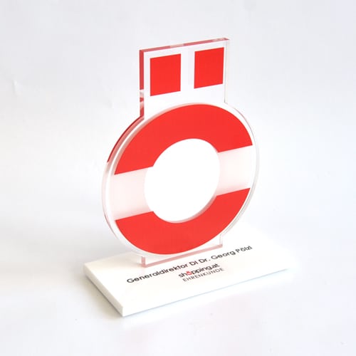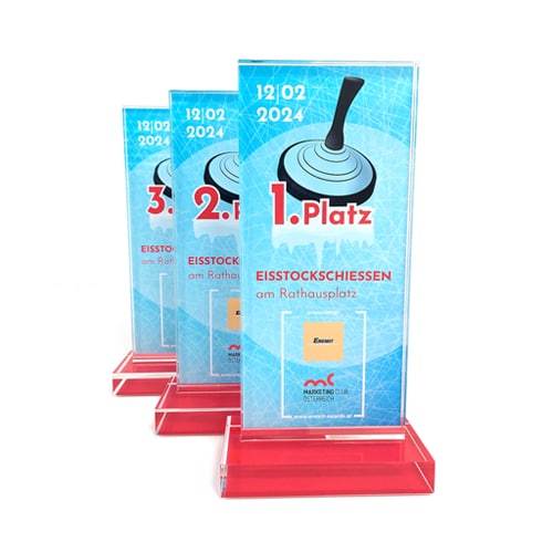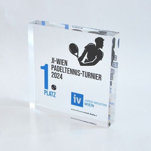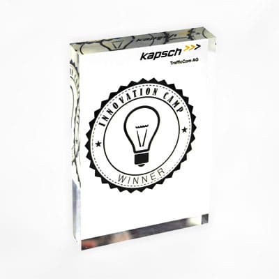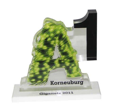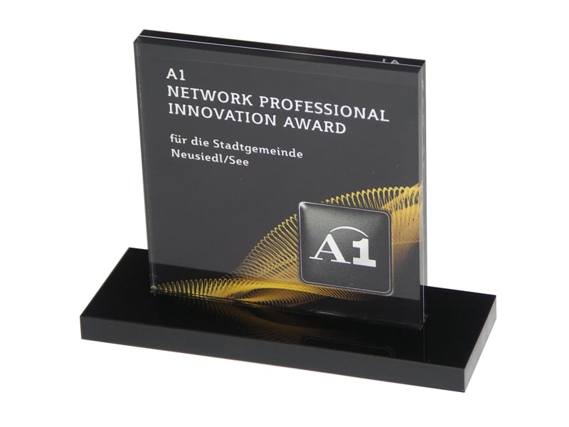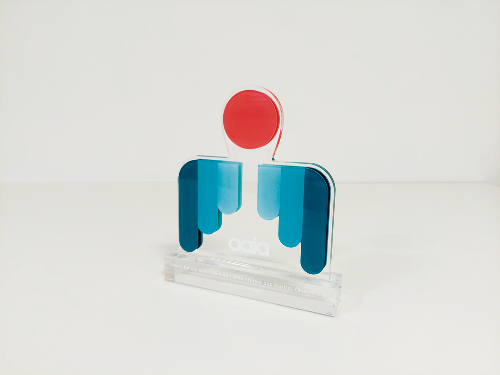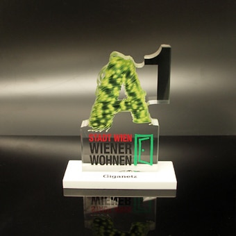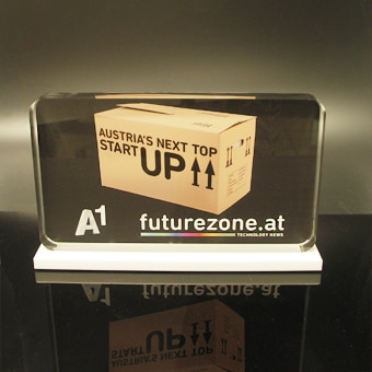 Um diesen Pokal und um 10.000 Euro ging es im A1 Start Up Campus. Ein Pokal gefertigt aus weißem und glasklarem Acrylglas. Der Hinterglasdruck verleiht dem Pokal eine schöne Tiefenwirkung.