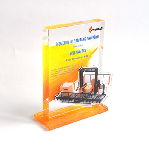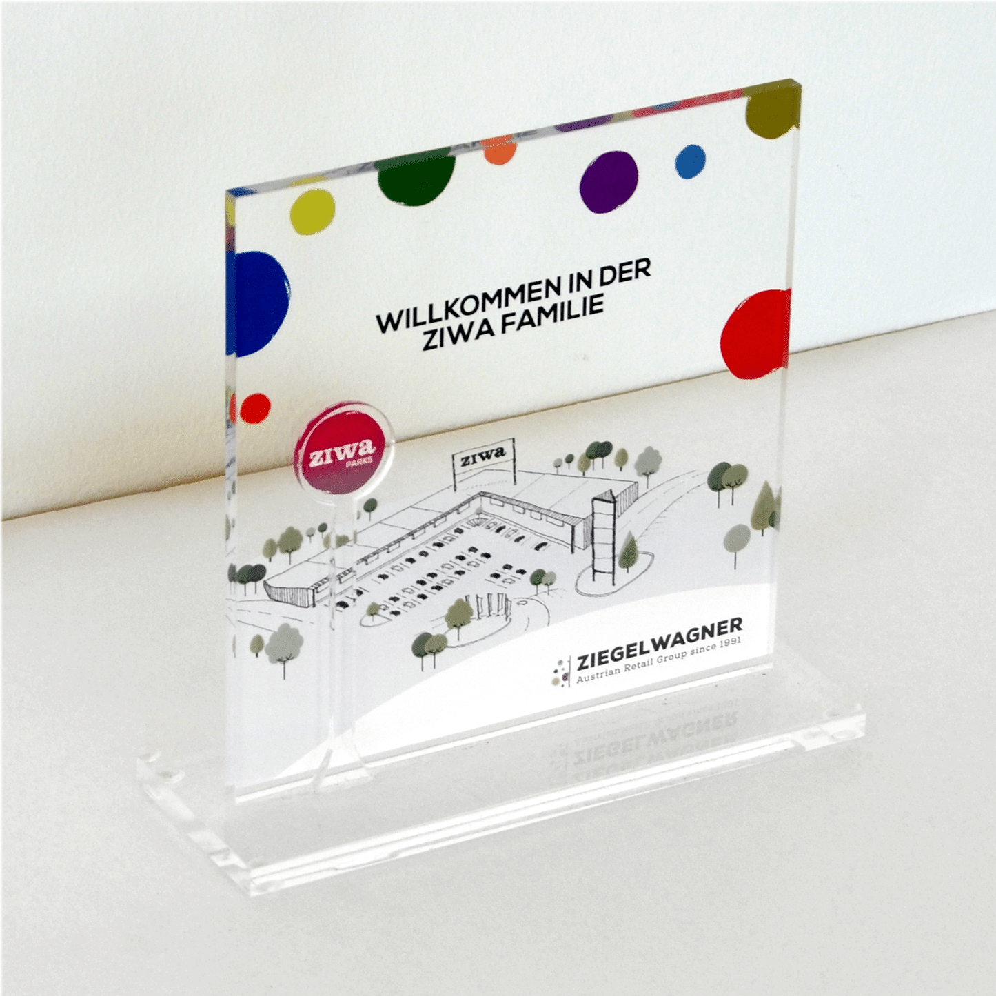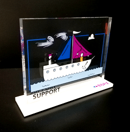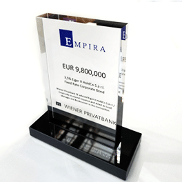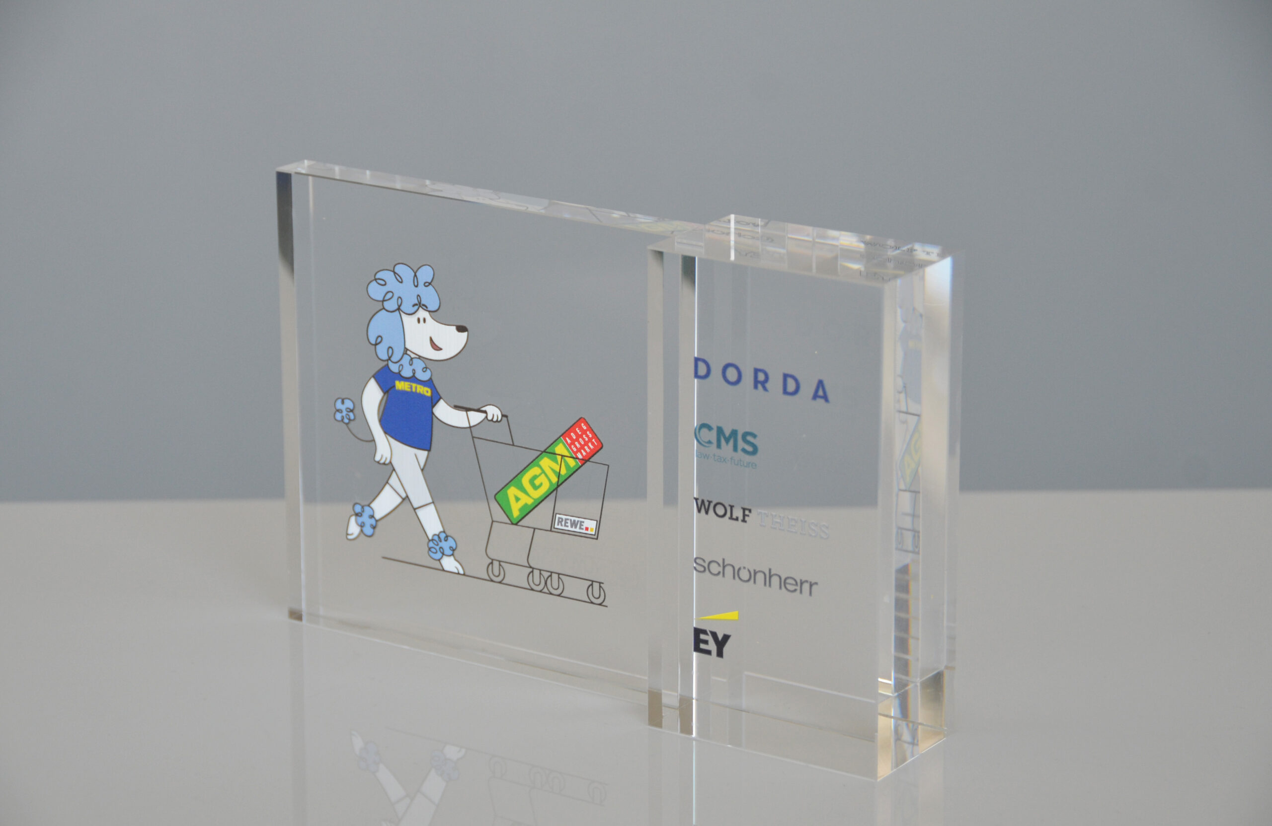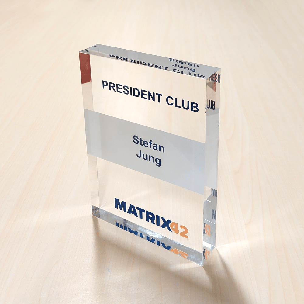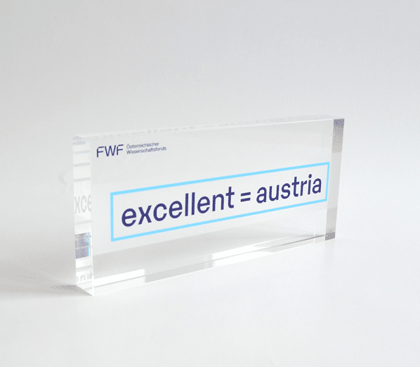 AWARD FÜR DEN PETER PICHLER PREIS Im Auftrag von MEGA Bildungsstiftung hatten wir die Ehre, gemeinsam den Award für den ersten Peter Pichler Preises zu designen und zu produzieren. Wir entschlossen uns dazu, das Grundelement des Awards aus einem glasklaren Sockel mit schwarzer Plakette, auf der mit weißem Digitaldruck der Name und das Jahr bedruckt wurde, zu kreieren. Darauf wurde eine glasklare Aufbauplatte mit doppelseitigen Digitaldruck des Logos platziert. Vollendet wurde der Awards mit einem Logoelement aus schwarzem Acrylglas, welches auf der Vorderseite befestigt wurde.