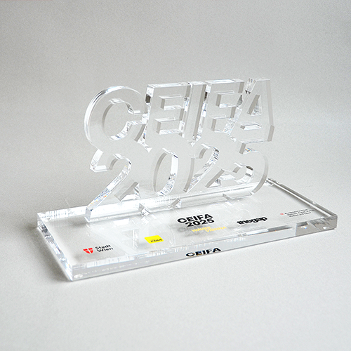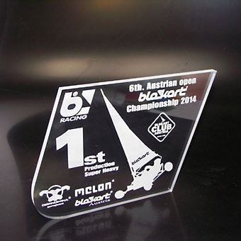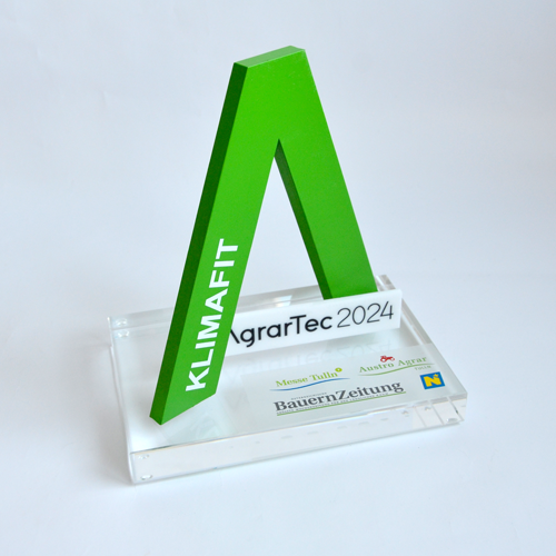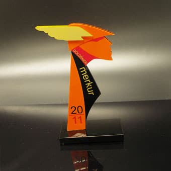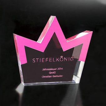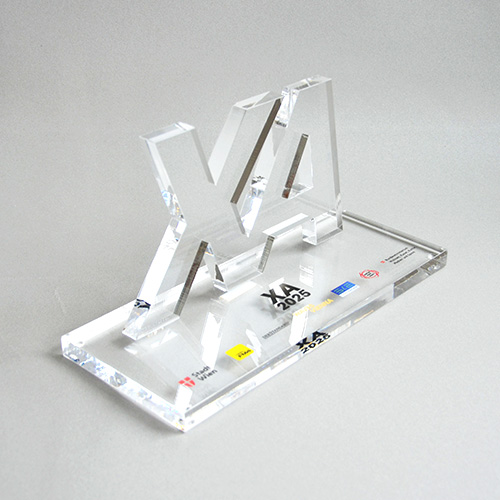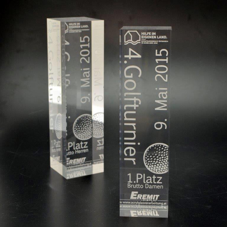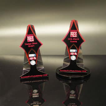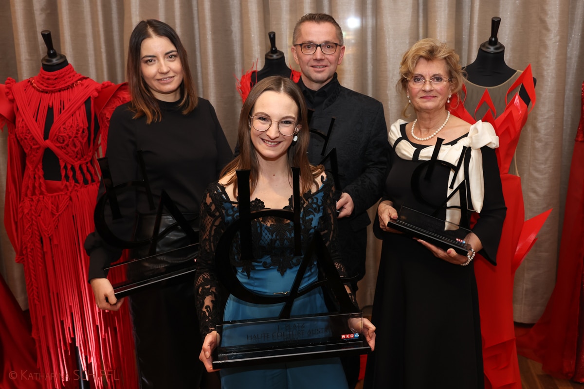 Für die gehobene Schneiderkunst ist der „Haute Couture Award“ das österreichische Fashion Event. Eine Jury aus Prominenz und Fachleuten kürten die Sieger mit einem einmaligen Award aus dem Hause Eremit. Dem „Haute Couture Austria-Logo“ nachempfundene Award symbolisiert in drei unter schiedlichen Größen die Rangordnung der Preisträger. Mittels Laser wurde die Buchstaben-Kontur geschnitten. Hier trifft schwarzes auf glasklares Acrylglas.