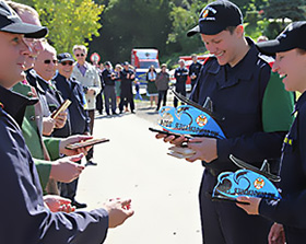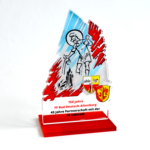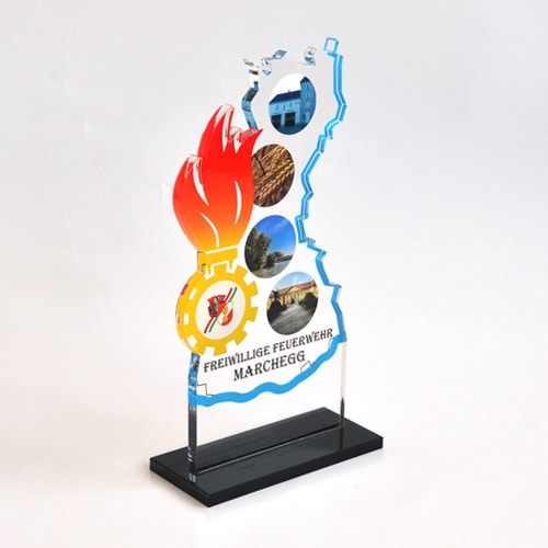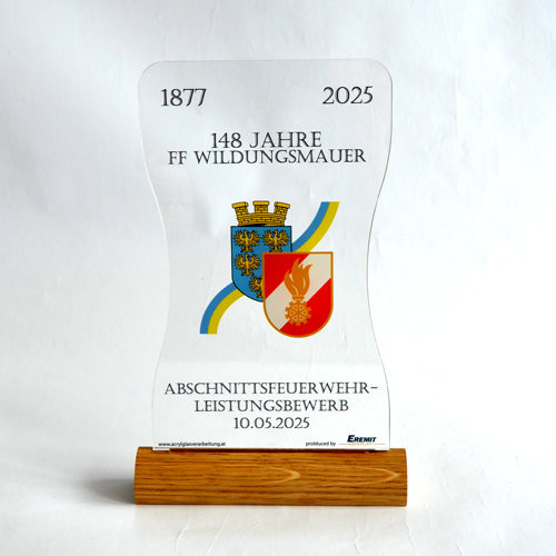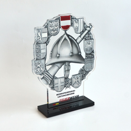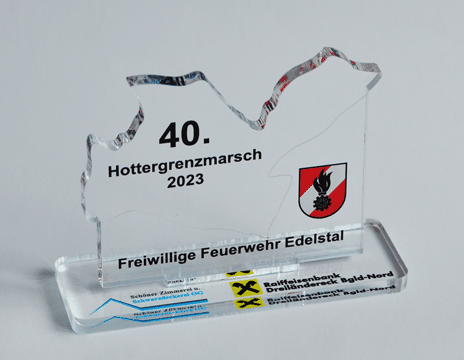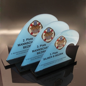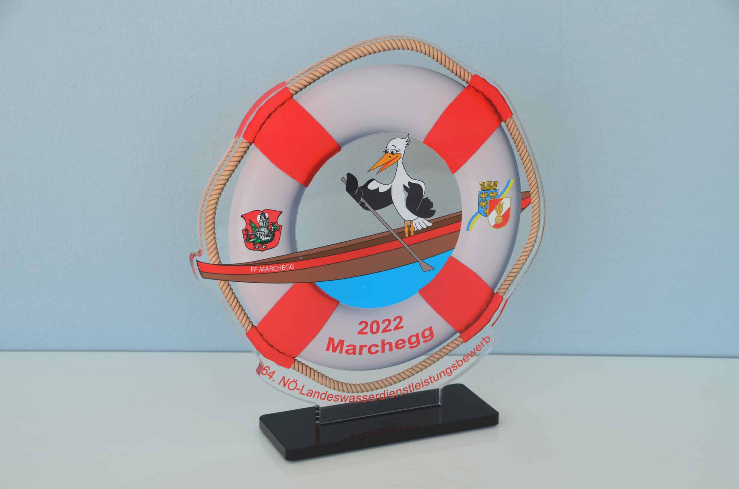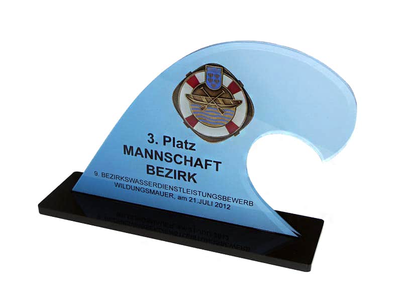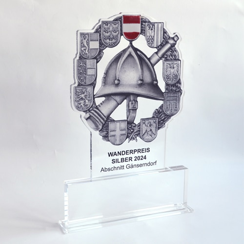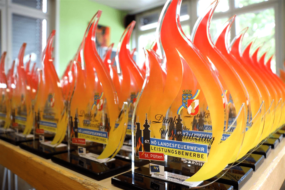 64. NÖ-Landeswasserdienstleistungsbewerb Ein Bewerb, für den unsere Grafikerin in Zusammenarbeit mit der Freiwillige Feuerwehr der Stadt Marchegg das Design für die Pokale gestalten durfte. Die Pokale variierten je nach Platzierung bei der Größe und wurden aus einem transparenten Acrylglas mit Hinterglas Digitaldruck und schwarzem Acrylglas-Sockel gefertigt.