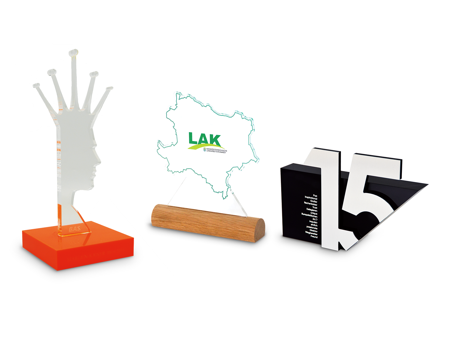 Hier bieten wir Ihnen eine Übersicht diverser Auszeichnungen unterschiedlicher Themengruppen, die als Inspiration dienen soll. Schauen Sie sich unsere Beispiele an und lassen Sie sich von unserer Qualität und Vielfalt überzeugen. Wir freuen uns auf Ihre Anfrage.